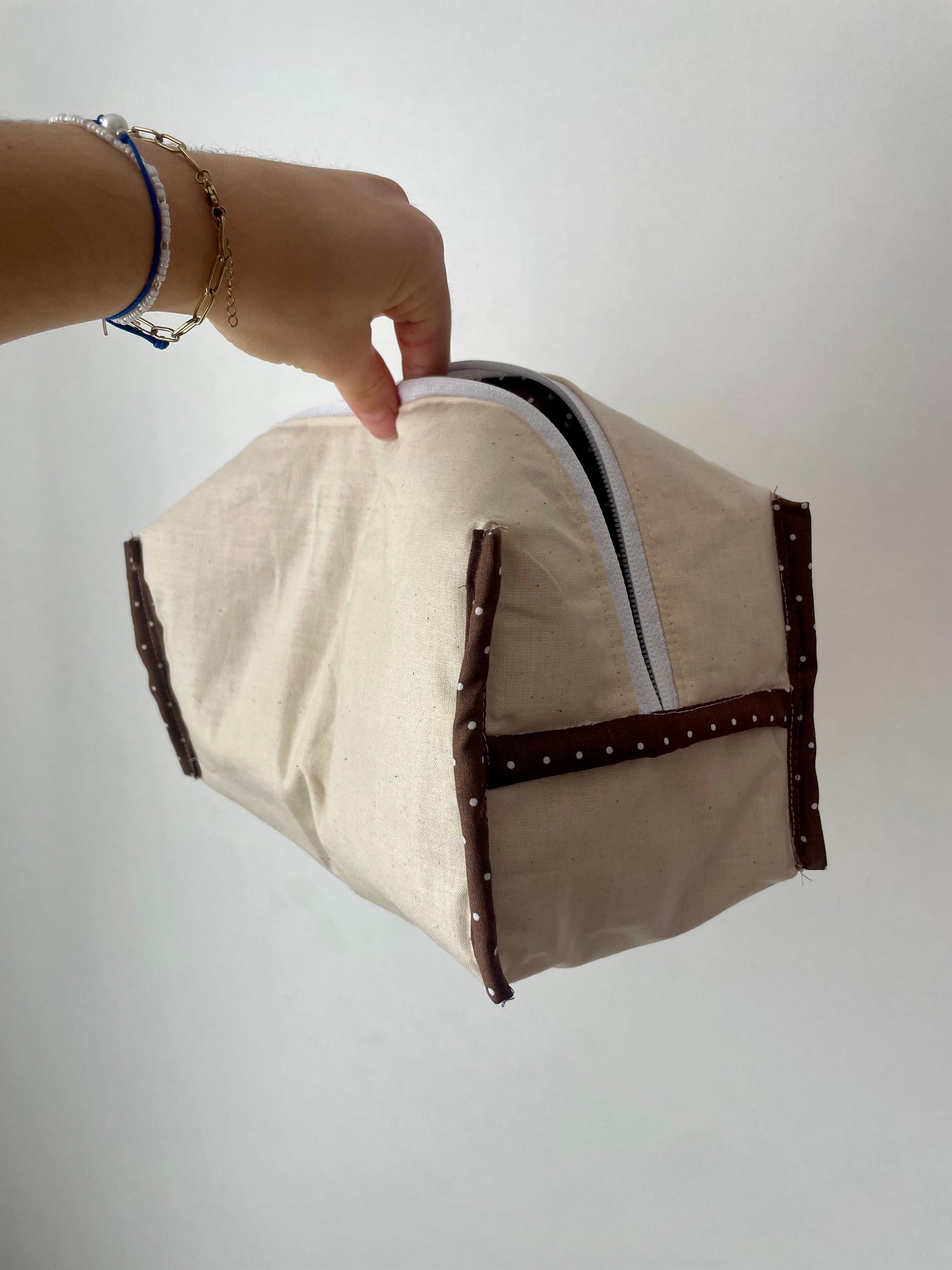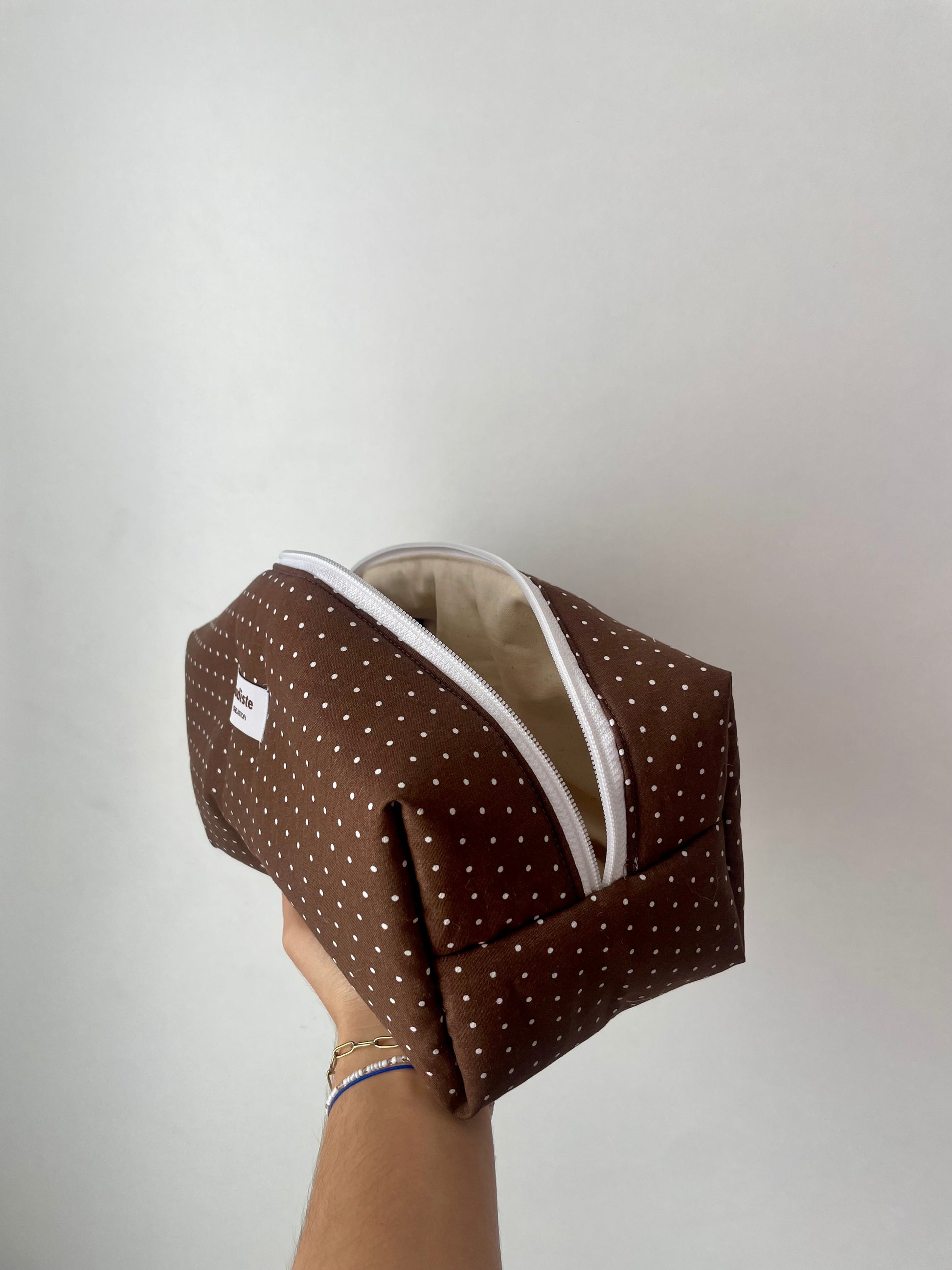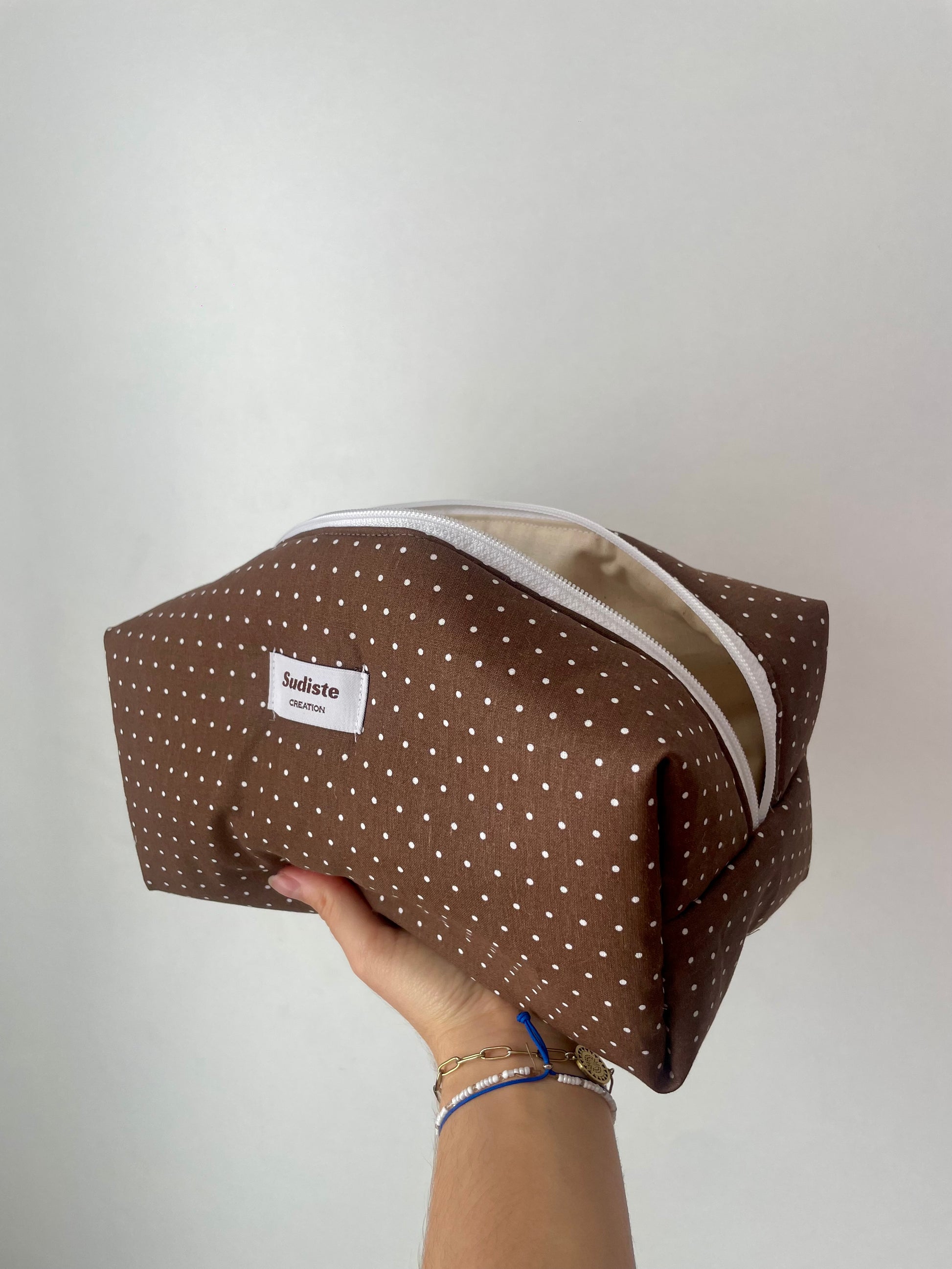Trousse de toilette/ maquillage SudisteCréation - Motif marron à pois blanc.